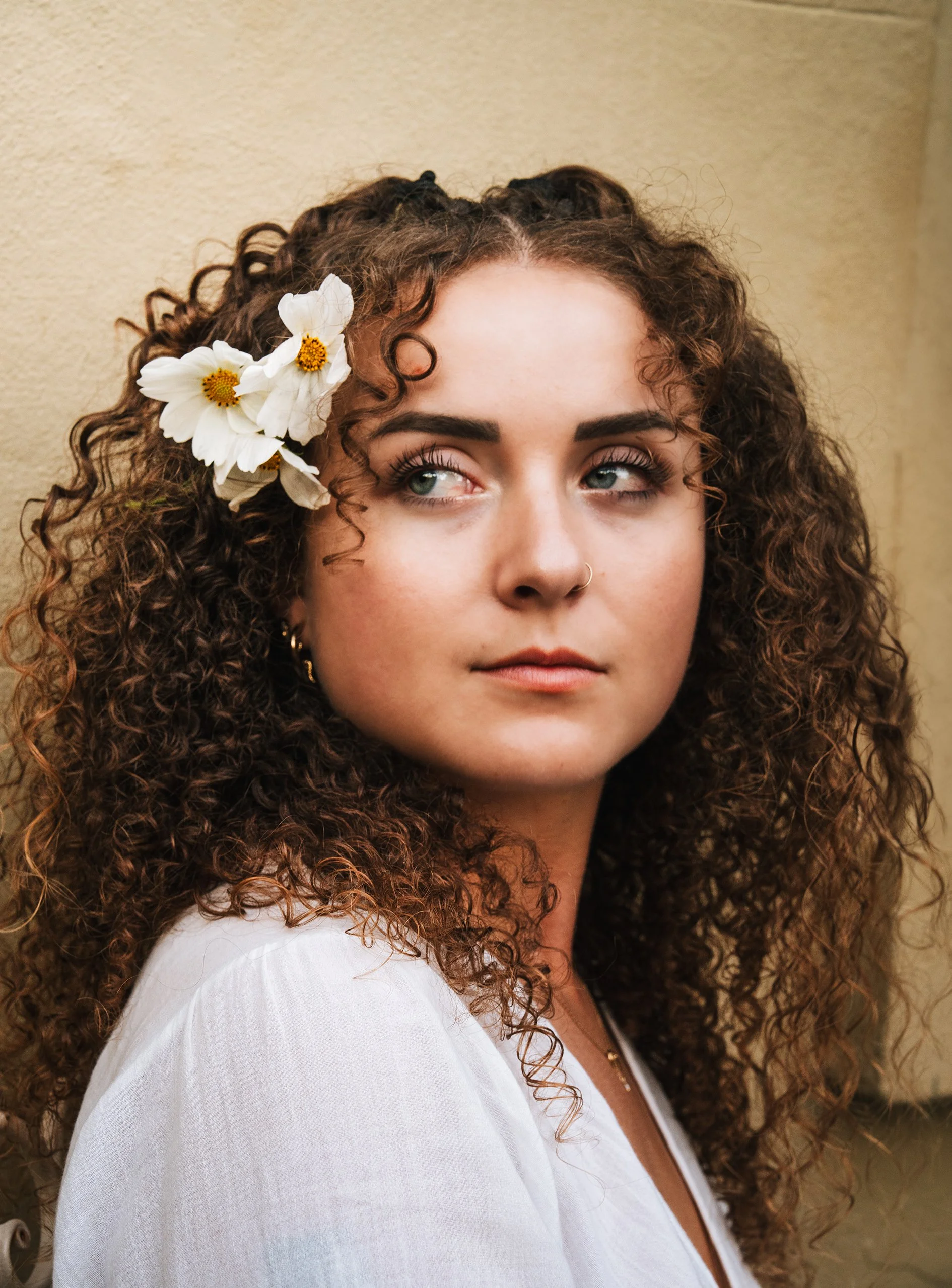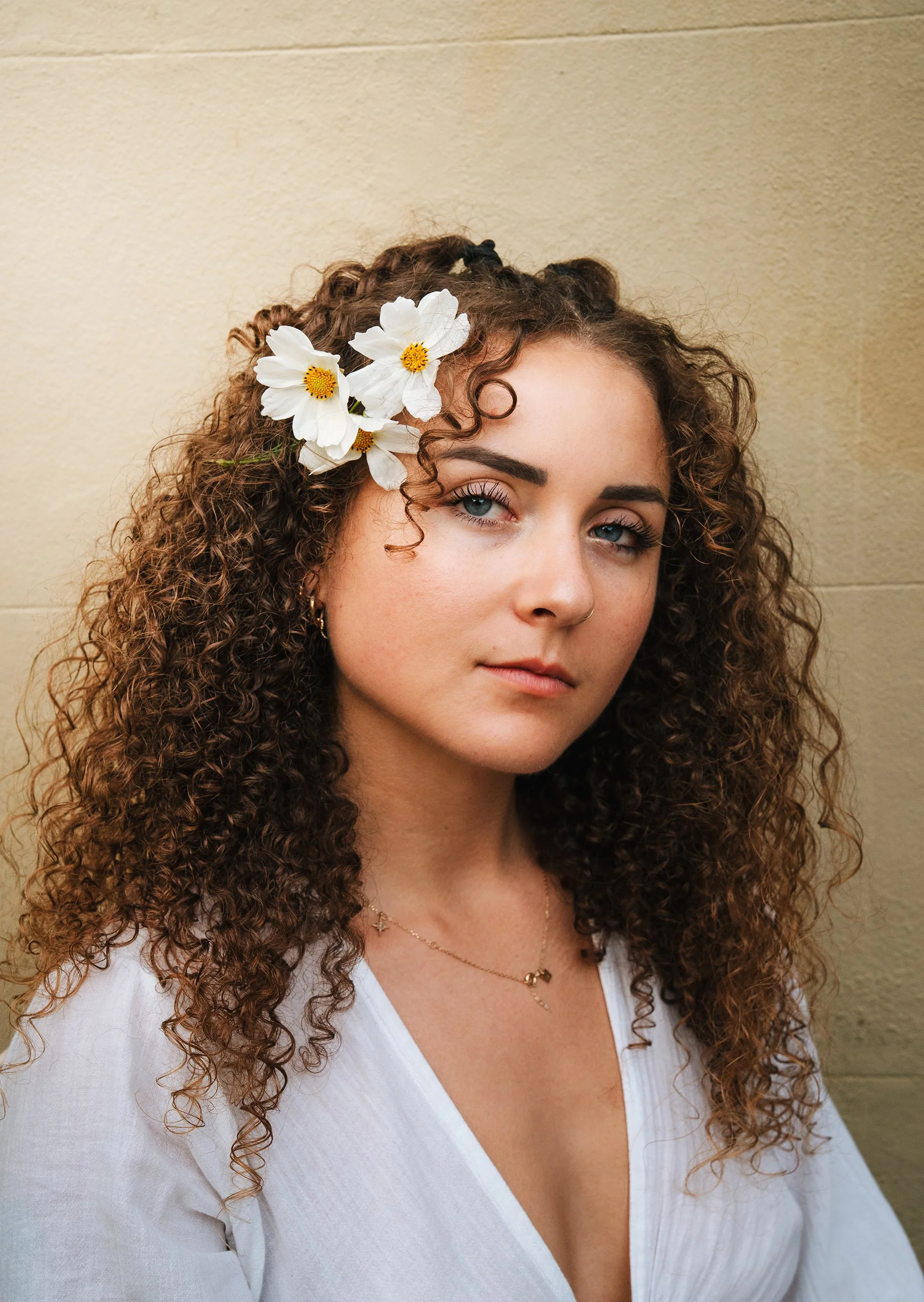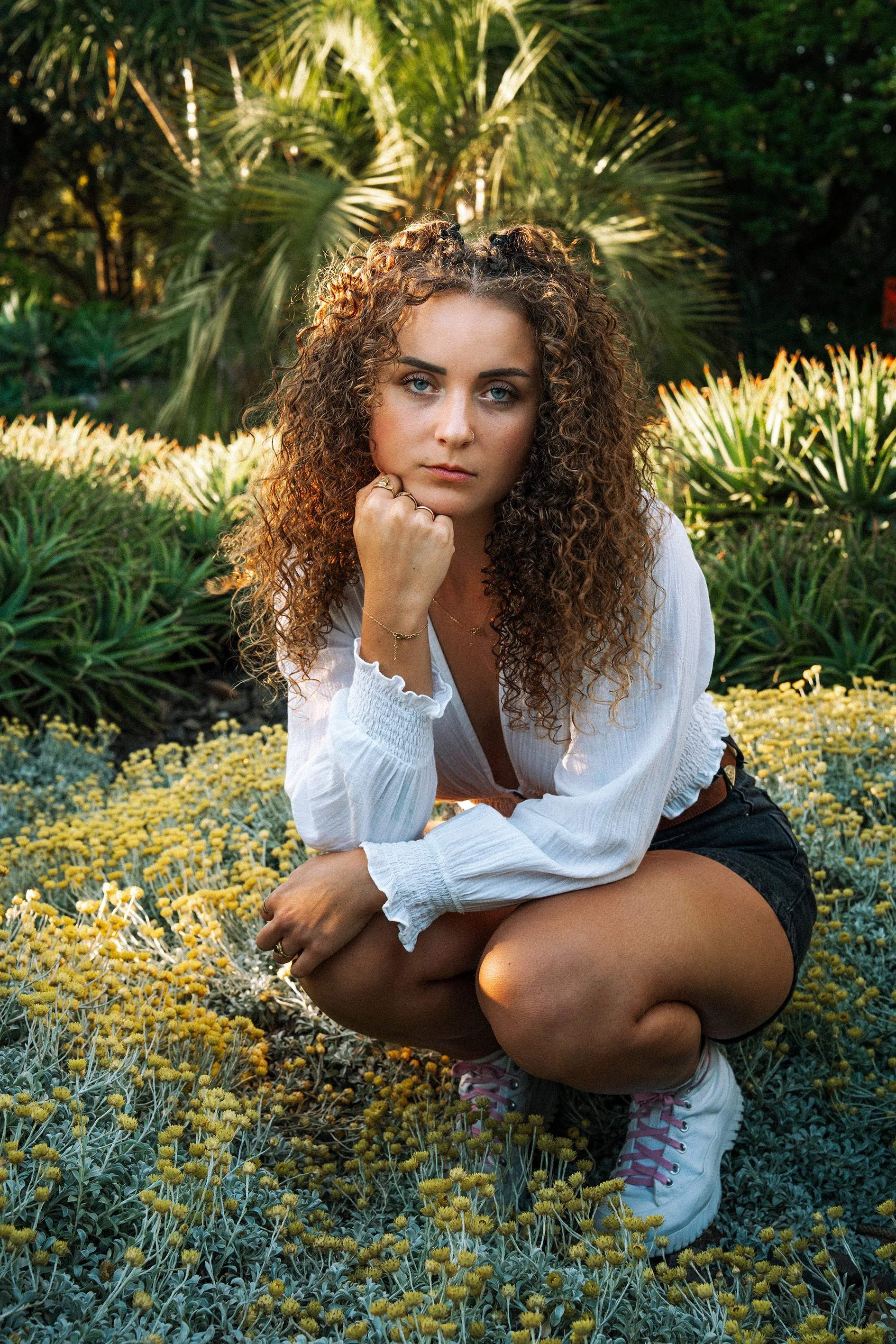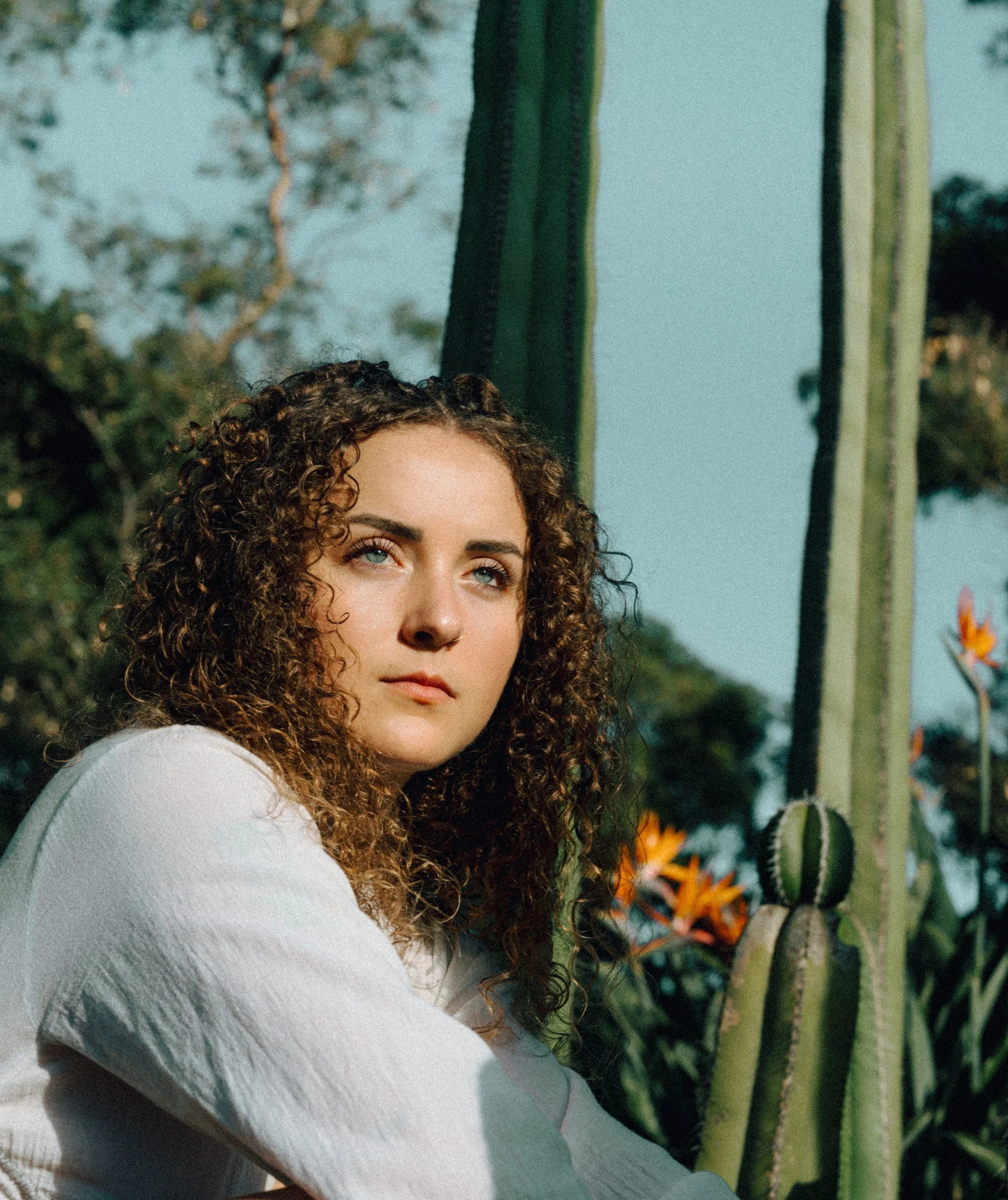 An experimental outdoor shoot with Laura, crafted to embrace natural tones and a soft, earthy color palette. These images showcase Laura’s radiant features against a backdrop of sun-draped cacti and blooming wildflowers